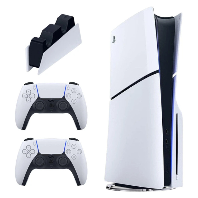 کنسول بازی سونی مدل PlayStation 5 Slim نسخه دیسک‌خور، ریجن آسیا سری 2000 با ظرفیت حافظه داخلی 1 ترابایت به همراه یک عدد کنترلر اضافه به رنگ‌ و پایه شارژر کنترلر، حداکثر وضوح تصویر خروجی 4K